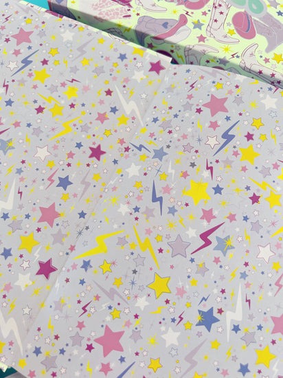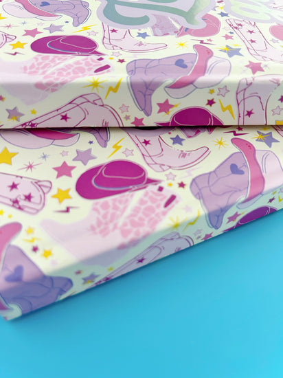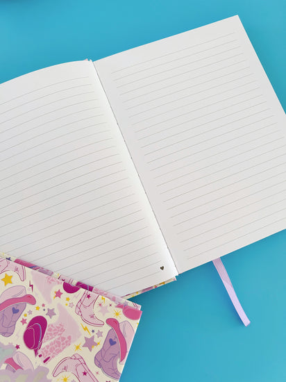 This notebook showcases a fun western cowgirl motif with the words Let’s Go Girl on the outside cover and a coordinating star design on the inside cover.